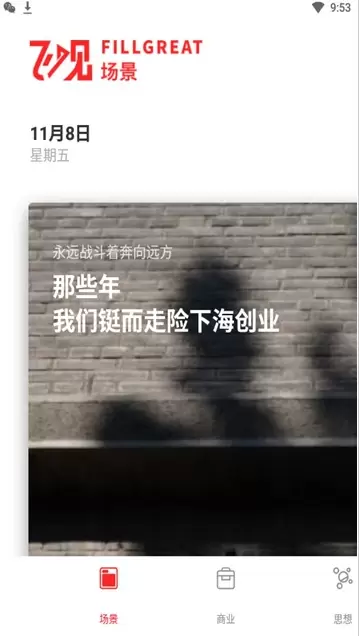 飞观软件,一款为您打开商业信息粉尘时代的app。是由北京如是纪录文化传媒有限公司所推广的商业分享社区平台,专为你严选一切有质量商业价值信息。永远战斗者奔跑向远方,那些年,我们挺而走险下海创业的经验,都会在飞观app以短视频的形式为您呈现出来。巩固你的基业长青秘密,带你走进商业化的大门。