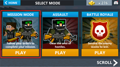 1、进入游戏后,玩家通过点击画面右下角的PLAY MODE进入游戏模式选择,亦或是在开始游戏前点击左下角按键更换武器;