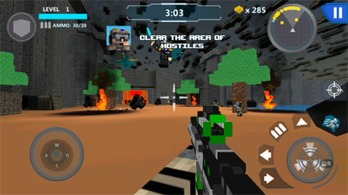 4、玩家需要利用虚拟摇杆进行走位,通过划动屏幕完成瞄准,点击射击按钮进行攻击,消灭目标以完成挑战。