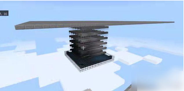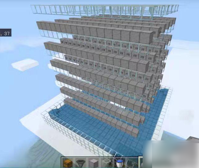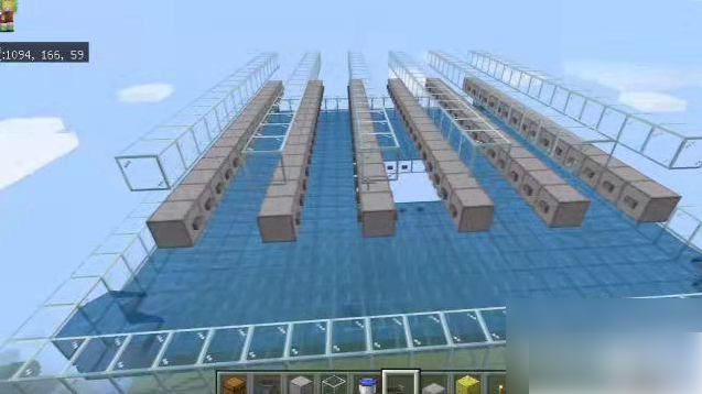 3、在距离下面流水的平台3格的距离位置搭建17×1的平台,一共建造6个这样的平台,每个平台之间距离是两格,距离边缘是3格,离平台一格的位置放相同规格的玻璃,平台侧边放上按钮,玻璃的作用是把刷新在平台的怪物挤下去,这是刷怪的平台。