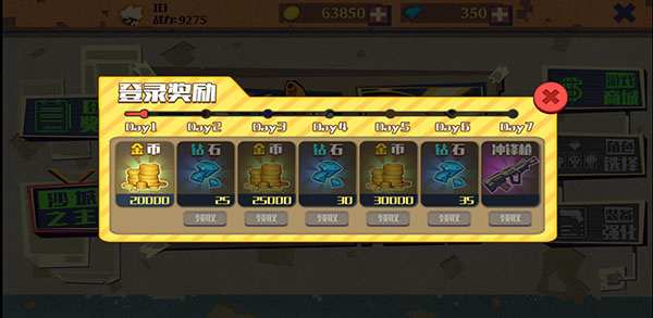 1、游戏中可以通过每日登录获得金币,还有一些武器、角色;