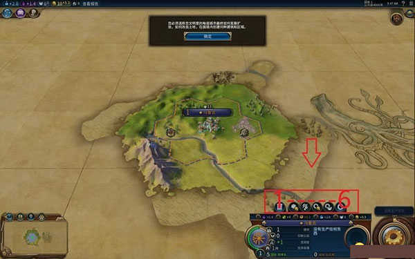你有一座城市了,我们来看如何运作,箭头所示的城市功能键,从1到6编号: