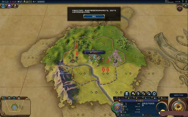 2、每回合,你都能从你每一个六角形地块里获得收益,收益情况由地块出产决定。