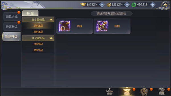 界面可以打造2~3转红2星、红3星饰品。打造红2星饰品需要3件对应阶段的橙2星装备;打造红3星饰品需要3件对应阶段的红2星饰品。