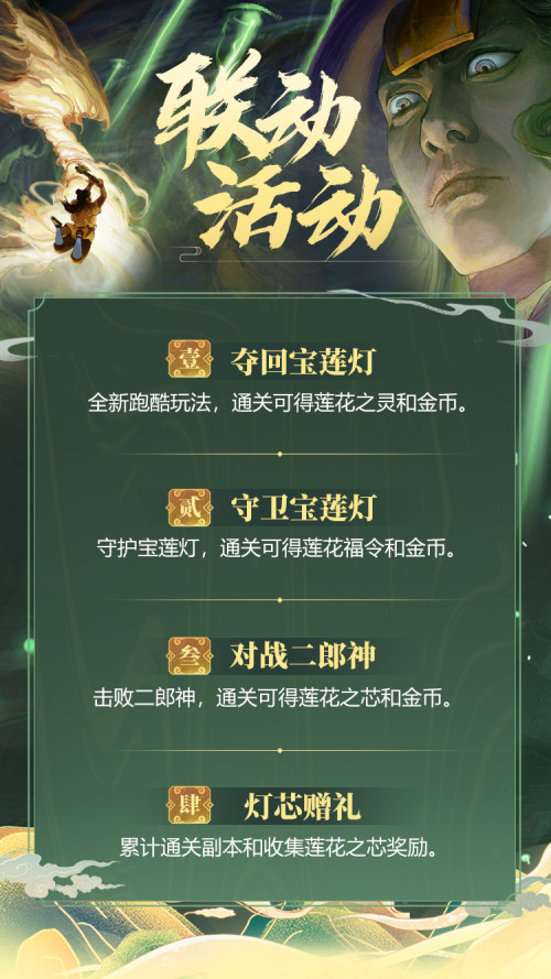 除了福利丰厚的点灯活动外,《魔渊之刃》x《宝莲灯》联动版本还有哪些惊喜内容呢?活动页面中也对联动版本的相关活动进行了爆料。联动期间将新增3个活动副本,每周一个全新玩法。包括【勇夺宝莲灯】、【守卫宝莲灯】和【对战二郎神】,按照每周一个的频率依次解锁上线。全新的跑酷玩法,经典的守护雅典娜玩法,和惊险刺激的Boss战,将会给封魔人们带来全新的惊喜体验!游戏内还另外增加了福利活动,更多奖励等你来拿!