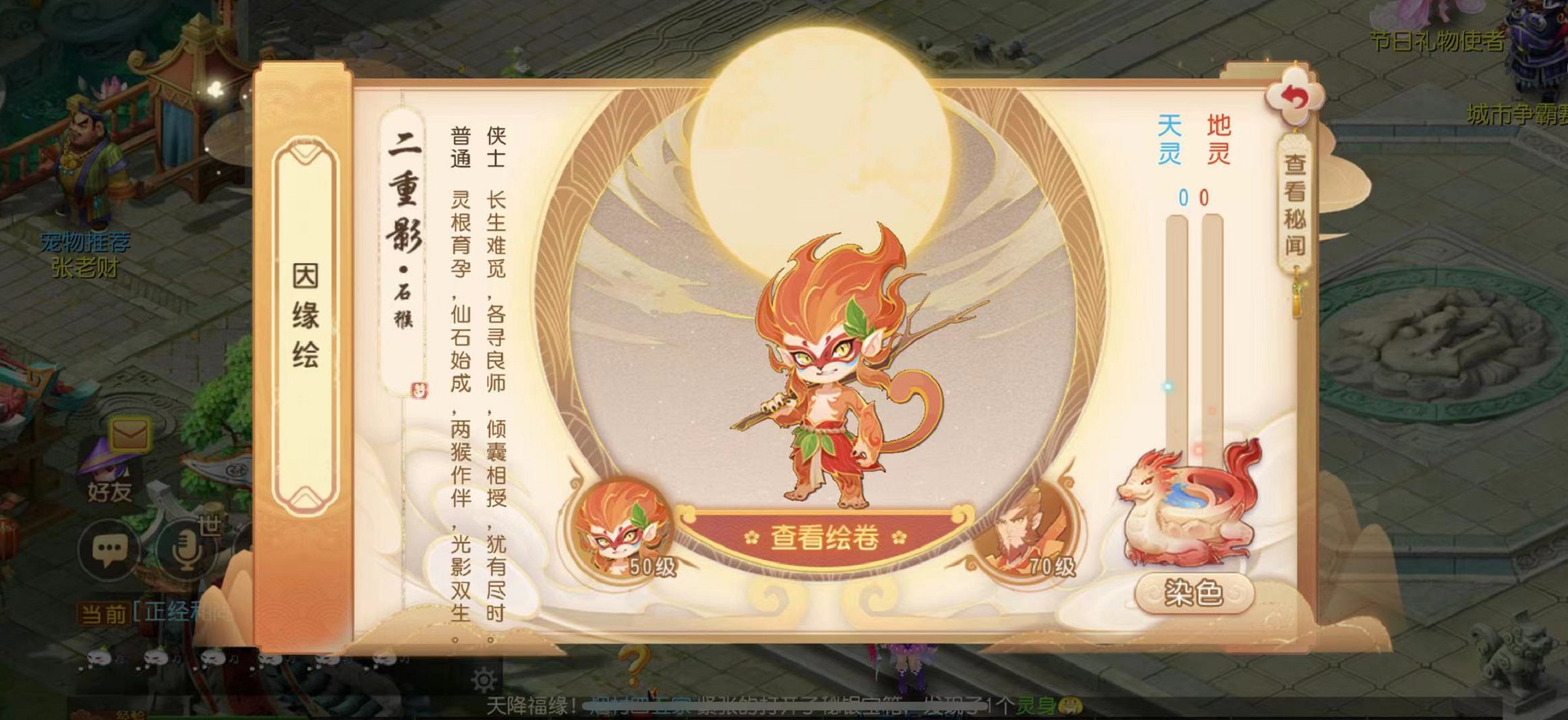 如果玩家等级≥50级,那么可以体验因缘绘的二重影副本。在遥远的过去,仙石因为感天地灵气而化为灵猴,开启了他们的全新旅途。两只灵猴如同光与影一般,虽然各有强烈个性,却难分彼此。在这之后,他们因为不同的境遇,人生也出现了不同的分歧。