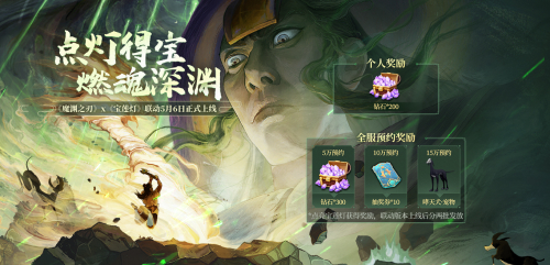 本周更新后,游戏内外会提前上线《魔渊之刃》x《宝莲灯》联动版本的预约点灯活动。点亮自己的宝莲灯,即可获得200钻个人奖励;全服点亮次数达到对应5w/10w/15w档位,还能解锁更多奖励。全服点亮预约人数达15w,所有参与点灯活动的玩家将获得强力宠物·哮天犬!