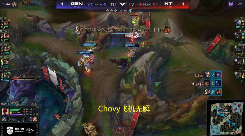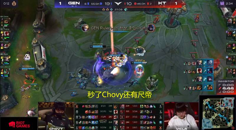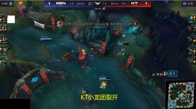 没办法打出突破口的KT,被GEN拖到了中期,双poke英雄飞机EZ魔切成型,Chovy与尺帝团战伤害拉满,KT的双刺客冲阵又面临着卡尔玛盲僧的保护,23分钟GEN直接大龙逼团,飞机的高额伤害瞬秒KT前排,刚进场的VicLa阿卡丽甚至还没碰到人就已经被打残,正面团完全不是对手。