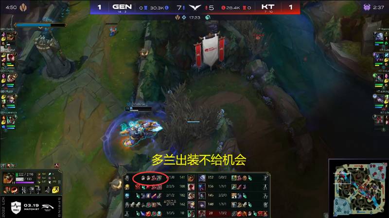 中下半区被陷入劣势的KT选择转战上路,Cuzz挖掘机也无愧绝活之名,成功配合哥狗熊越塔将多兰鳄鱼击杀后,出到暗爪连续找到机会打击杀,GEN除了辅助以外全都被抓死过,但可惜的是这局多兰也深知自己不能成为突破口,直接就是布甲拉满,不给哥任何单杀机会!