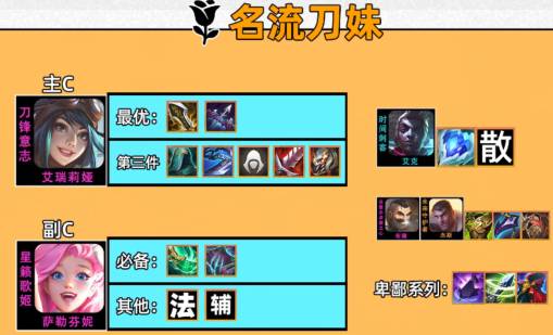 副C萨勒芬妮,必备装备青龙刀、鬼书,其他的就是看散件做法强输出装或者功能型装备。艾克、布隆、杰斯则是捡垃圾,艾克可以做冰心,或者其他的散件,布隆和杰斯则是捡肉装。