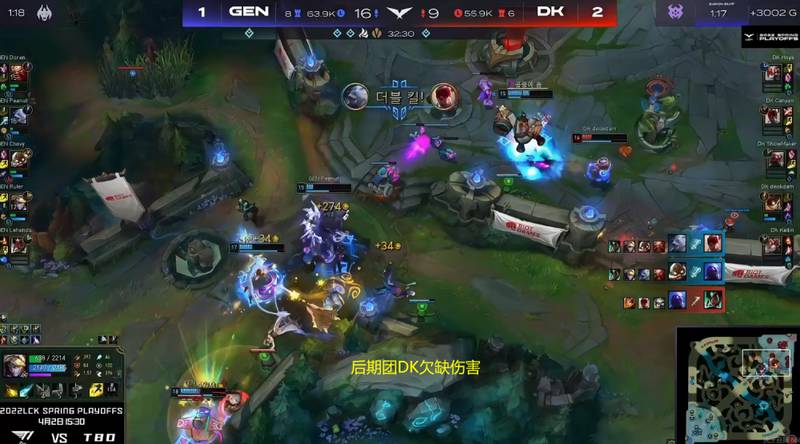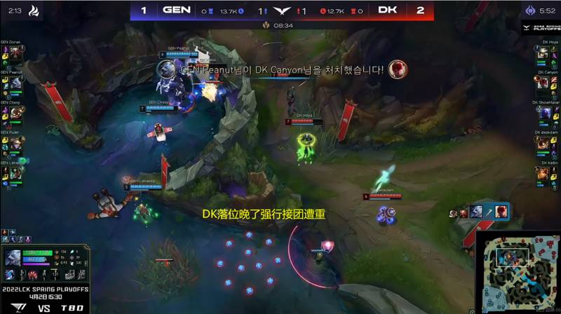 8分钟的关键峡谷先锋团战,GEN也是率先占据位置rush掉了先锋,DK迟来的情况下想要留人,但第一时间集火的目标是多兰酒桶,交了大量技能打出击杀后,GEN其余人完全不受限制,无压力输出轻松击杀三叔盲僧!