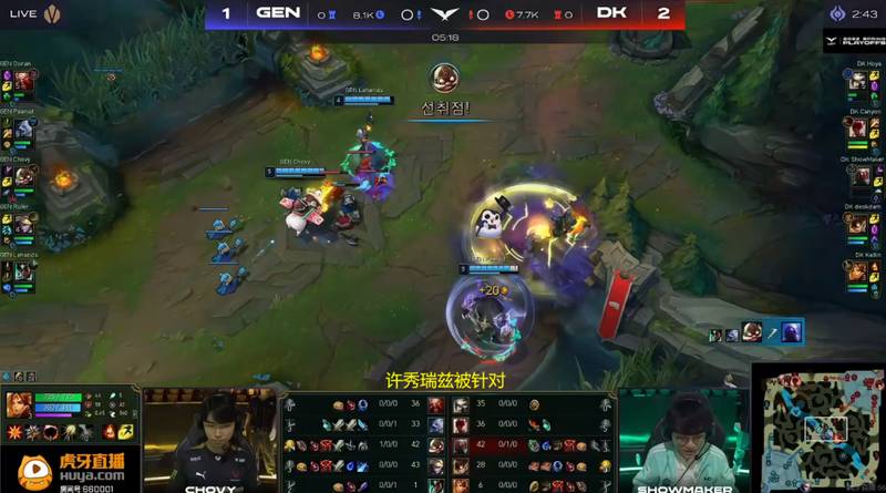 在开局的时候GEN目标也非常明确,就是保着Chovy飞机打,小花生狗熊第一波gank没能得手,但随即就依靠着下路对线优势,Lehends卡尔玛先行游走中路,野辅的包夹配合帮助飞机拿到了一血,中路直接天胡开局!
