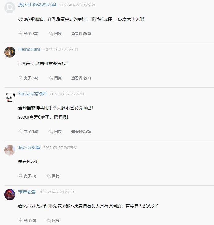 还有网友表示“这四把是上单差距,看来小老虎之前那么多次都不愿意掏石头人是有原因的,直接养大BOSS了,小老虎这次季后赛的表现可以晋升四天王了 ,edg这边学弟这轮血c,小凤凰夏季赛加油吧。”