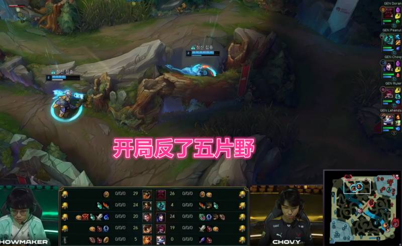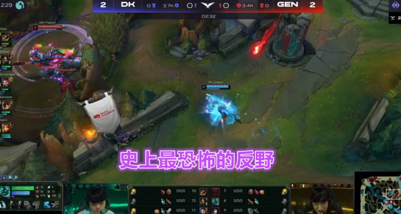 GEN人马认怂打算回去刷上半区,没想到Canyon三级豹女直接当着视野越过中路二塔,再次赶走人马!结果就是DK豹女刚开局就反了五片野,人马只刷了一组野怪,GEN野区直接崩盘了!