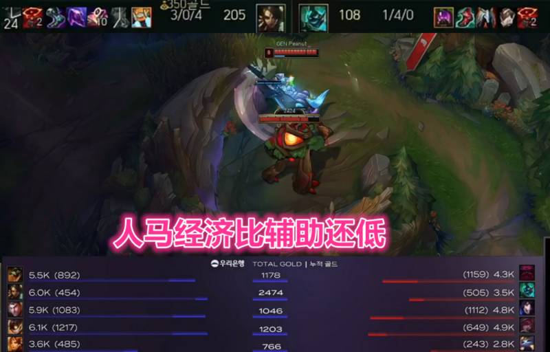 后续Canyon豹女继续蛮横入侵,还能帮队友滚动雪球,人马被搞得无野可刷,经济甚至比辅助女坦还要低,对位落后一百刀,不知道的还以为GEN战队打野掉线了。