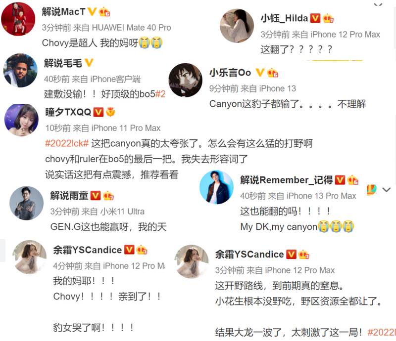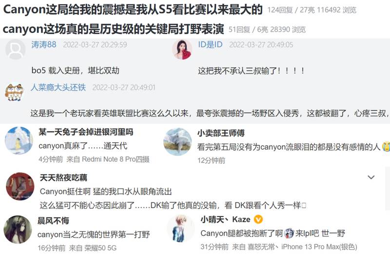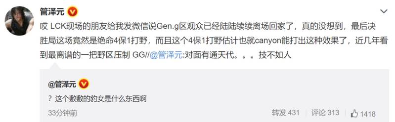 Canyon把LCK季后赛当成排位代练局在打,解说管泽元作为GEN粉丝都绝望了,发微博感慨道:“GEN观众席已经陆续回家了,对面有通天代技不如人,也就Canyon能打出这种效果了,近几年见过最离谱的一把野区压制!”