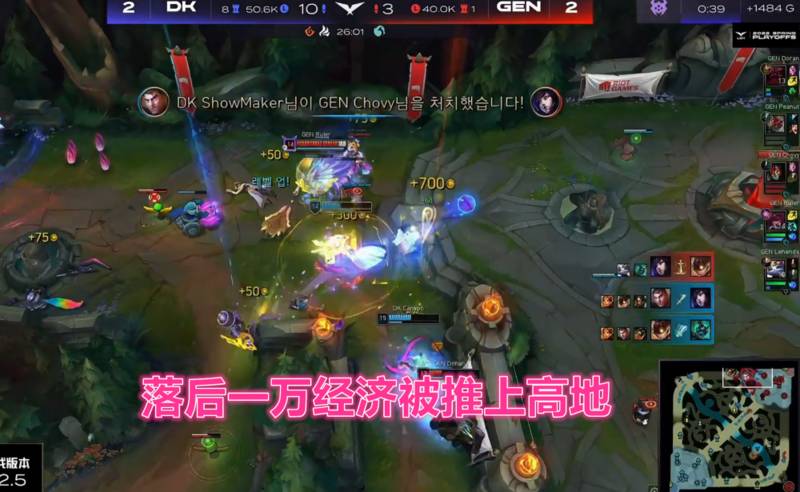 DK战队依靠野区的个人优势,20分钟领先一万经济,26分钟推上高地,所有人心里都已经给GEN宣判死刑了。然而DK其他人都在拖打野后腿,中单杰斯对线狐狸被压了几十刀,鳄鱼炸弹人拖到后期也很乏力,冲高地那波团战没处理好导致局面陷入僵局。