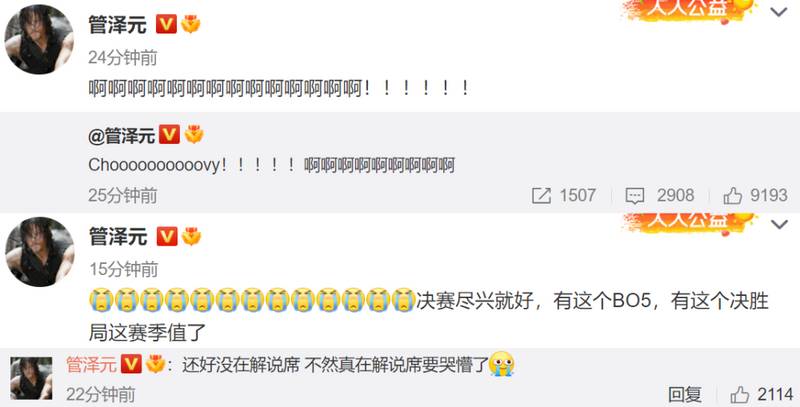 其中最激动的莫过于管泽元了,前期Canyon的恐怖反野让他放弃希望,结果GEN完成奇迹翻盘,管泽元也是激动哭了:“决赛尽兴就好,有这个BO5有这个决胜局,这赛季值了!还好没再解说席,不然真要在解说席哭懵了!”只能说管大校名不虚传,即使通天代也顶不住他的毒奶!