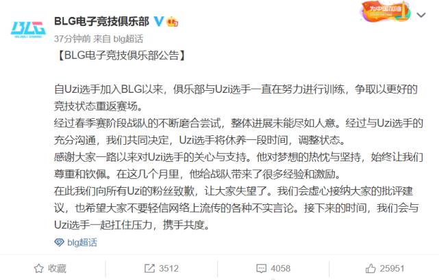 而在BLG官宣后,Uzi本人也转发了BLG的官博,表示自己会休整一段时间,希望大家可以继续支持BLG。